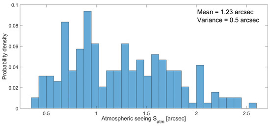 Having assumed that a telescope operates in the presence of atmospheric turbulence, the angular resolution Satm (i.e., astronomical seeing) in (rad) is given in Equation (15). Based on Equations (13) and (15), Satm is provided in Figure 7. If the scintillations are negligibly small, the astronomical seeing is only diffraction-limited, and the coherence length in Equation (15) is substituted with the telescope’s diameter.