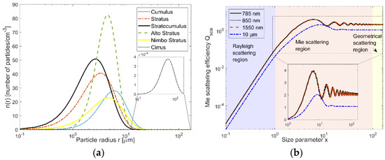 Clouds characterization: (a) modified Gamma PSDs for the primary six types of clouds; (b) modelling of Mie scattering efficiency Qsca versus size parameter x.