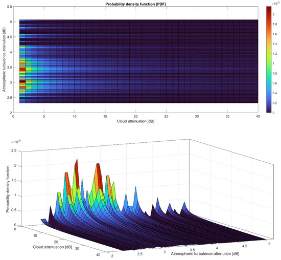 Once the simulated normalized histogram of the atmospheric-turbulence-induced attenuation (Figure 5) together with the considered probability density function of cloud attenuation (Equation (18)) modeled as a Log-Normal distribution is provided, Multivariate Statistical Analysis is considered. Having both attenuation variables (i.e., atmospheric turbulence and clouds losses) defined in the same probability space, the simulated joint probability density function on all possible optical attenuation pairs of output is provided in Figure 9.
