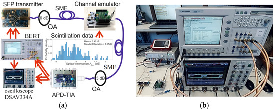 The described channel emulator provides the benefit of introducing atmospheric turbulence effect into an FSO system used hereby for an assessment of a high-end PD whose performance is crucial for next-generation FSO feeder links. In particular, the architecture of the built prototype used for emulation of satellite-to-ground FSO downlinks in controlled laboratory conditions consists of an optical transmitter, SMF-based optical channel emulator, a few fixed optical attenuators, receiver implementing high-end APD-TIA, oscilloscope, and BERT. Its block scheme is provided in Figure 11a, while the real experiment is depicted in Figure 11b.