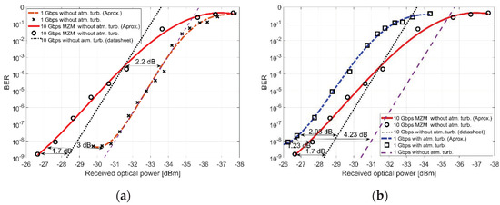 The measured and the approximated BER performance based on the introduced experimental setup applying Agilent N4906B BERT (Figure 11) is provided in Figure 12. Both 1 Gbps and 10 Gbps of a slant FSO propagation channel are evaluated with and without atmospheric turbulence. In addition to the accomplished measurements with the introduced MZM-based prototype board in Section 4, an ideal BER curve at 10 Gbps, which is provided in the FBR2178GB datasheet, is given in Figure 12a. When both curves are compared, there is up to 1.7 dB offset between them, which is explained by the higher quality MZM in the datasheet that is characterized with a minimum 25 dB extinction ratio [20]. Considering the observed power penalties at BER = 10−8, when the data rate is decreased from 10 Gbps to 1 Gbps, the appeared offset of 2.2–3 [dB] is due to improved sensitivity of the APD-TIA, once the information bandwidth is reduced. Furthermore, the approximated measured BER curve subject to the introduced tropospheric scintillations (Figure 5) at 1 Gpbs throughput is given in Figure 12b.
