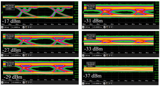 Finally, the six measured eye diagrams with DSAV334A (−17 dBm, −27 dBm, −29 dBm, −31 dBm, −33 dBm, and −37 dBm received optical power) that are shown in Figure 13 support the results completely. While the eye is gradually closing, there is still eye-opening even at −33 dBm that confirms the improved performance when data throughput drops. The eye is already wholly closed at −37 dBm.