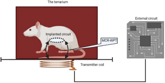 A fully implantable electrical nerve stimulator: the implanted circuit with a rectifier and receive coil (TX), the transmit coil (RX) under the terrarium supplies energy by using magnetically coupled resonant wireless power transfer (MCR-WPT), the external circuit is used to generate signals.