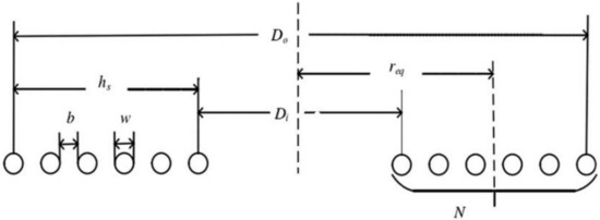The cross-section of the planar spiral coil. The Di is the inner diameter; the req is the equivalent radius of the coil; the hs is the width of the coil.