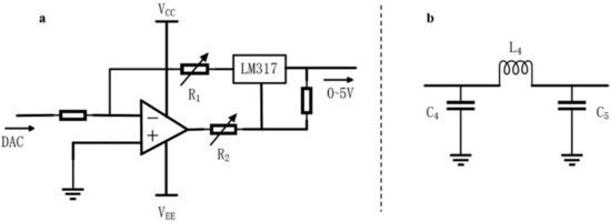 (a) The control circuit diagram of DAC output. The input is the DAC voltage of 0–3.3 V. The output voltage is 0–5 V; (b) The π type impedance matching network.