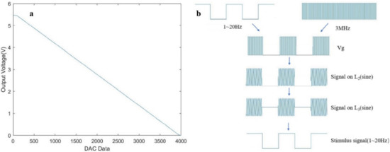 (a) The relationship between the DAC setting values and the output voltages; (b) The signal transmission process.