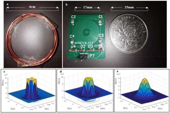 The fabrication of coils: (a) The TX coil; (b) The RX coil and receiving circuit on the left; (c) The magnetic field stimulation of TX coil on the plane with transmission distance D = 1 cm; (d) D = 2 cm; (e) D = 5 cm.