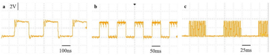 It can be seen from Figure 7 that the Vg signal will be directly used for switching control of the transistor, thus generating the oscillation wave patterns transmitting coil and sending them to the receiving circuit. Figure 8 shows that the minimum pulse width of S is about 200 μs. Duty cycle (1–50%), and frequency (1–20 Hz) can be changed within the set range, with an accuracy of 1% and 1 Hz, respectively. Simultaneously, the DAC function of the SCM controls the input voltage of the Class E PA in 0–5 V, and the adjustment accuracy is 0.7 mV. The stimulator can perform diverse and flexible work according to actual needs.
