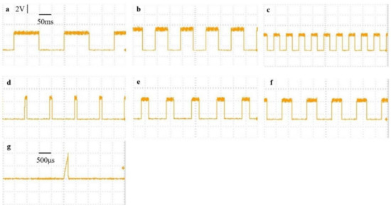 The stimulus signal of different parameters: (a–c) the stimulus signal of different frequencies: 20 Hz, 10 Hz, 5 Hz; (d–f) the stimulus signal of different duty cycles:10%, 20%, 40%; (g) the minimum pulse width is about 200 μs when the duty cycle is 0.01.
