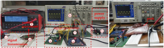 The experiments of output performance test with different media: air (left) and pork (right). The testing instruments used are multimeter (UNI-T UT805A, a), oscilloscope (Tektronix TDS 1012C-EDU, b). In the picture, the c is the simulated load impedance; the d represents for the TX coil and the RX coil and they move vertically in a coaxial way; the e is the Class E PA circuit; the f is LM317 controllable constant-voltage circuit; the g is STM32 microcontroller; and the h is switching power supply to make the LM317 work.