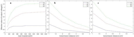 First, at transmission distance D = 1 cm, the output capacity of the system is tested by changing the value of load impedance (100 Ω–2 kΩ) and VDD value (1 V, 2 V, 3 V). The voltage effective values under different loads and supply voltages are shown in Figure 10a. After that, the load impedance value (1 kΩ) was fixed to test the variation of the induced voltage with the transmission distance (Figure 10b). In the end, we repeated the experiment using 2 cm thick pork as the medium (Figure 10c).