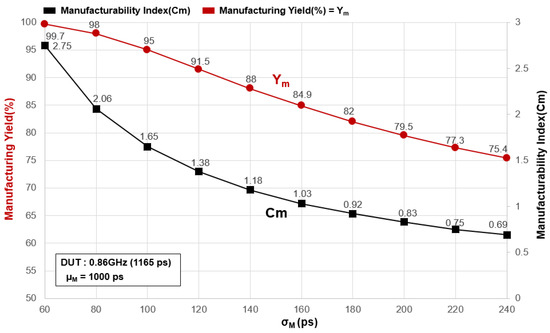 Next, we define Cm = (DS − μM)/σM as the manufacturability index [30]. The higher the Cm value, the better the manufacturing capability is than the design capability and the better the manufacturing yield (Ym). For example, as shown in Figure 3 and Table 1, DS = 1165 ps, and DUT X ~ N (x; μM = 1000 ps, σM = 100 ps), then Cm = 1.65; here, we can get the manufacturing yield Ym = 95%. When σM = 200 ps, and DS = 1165 ps, DUT X ~ N (x; μM = 1000 ps, σM = 200 ps), then Cm = 0.83, and the manufacturing yield Ym = 79.5%. When σM becomes increasingly larger, it means that the greater the manufacturing difference, the worse the manufacturing yield (Ym). When σM = 60 ps, the manufacturing variation is relatively small, DS = 1100 ps, DUT X ~ N (x; μM = 1000 ps, σM = 60 ps), then Cm = 2.75, we can get the manufacturing yield Ym = 99.7%. From the above results, we know that when σM becomes increasingly smaller (that is, the manufacturing capacity is better than the design capacity), the smaller the difference in manufacturing convenience, the better the manufacturing yield (Ym) will be. In semiconductor manufacturing, in the same situation of increasingly smaller σM, the size of chip components and conductor widths will gradually decrease. The complexity of the chip will double in 18–24 months because the area of the chip component is reduced by half. When the area of the chip is halved, the problem of small changes in the chip electrical parameters will become more serious. Therefore, from the above simulation results, it is understood that process changes have a significant impact on manufacturing yield.