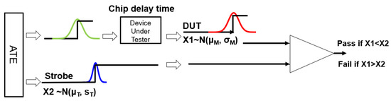 In this paper, automated test equipment (ATE) judges whether the DUT is “pass” or “fail” based on the comparison result of two signal timings (Figure 4). If the chip (chip delay time) arrives slower than the signal sent by the tester (X1 > X2), the ATE sends a fail signal and treats the chip as a failure. On the contrary, if the chip (chip delay time) arrives faster than the signal sent by the tester (X1 < X2), a pass signal is sent, and the chip is deemed qualified.