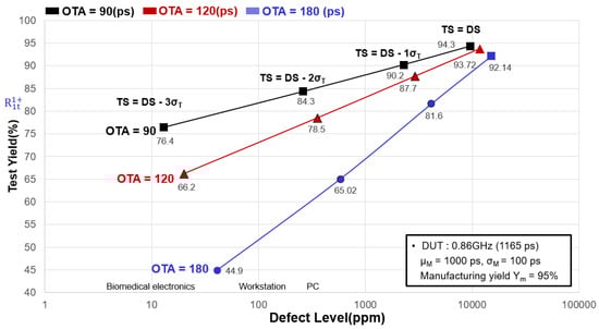 We considered the interaction between the overall timing accuracy (OTA) and Yt. We used data from Table 2 together with our proposed digital IC testing model (DITM: a test model and iterative yield estimation formula suitable for time-variant manufacturing processes) [30,31]. For the chip, DS = 1165 ps, circuit characteristic parameter X ~ N (x; μM = 1000 ps, σM = 100 ps), we obtain the manufacturing yield (or true yield) as being Ym = P[Good] = P[X < DS] = 95%. Using the traditional test methodology for DUT testing, we applied three different OTA values (90, 120, and 180 ps) (Figure 6 and Table 2). When a high-precision tester is selected (the tester characteristic parameter OTA was 90 ps), the test gave high yield and high quality; however, when a tester with low accuracy was selected (the tester characteristic parameter OTA was 180 ps), the obtained yield and quality tested increasingly worsened. We know that as the accuracy of the characteristic parameter OTA of the tester decreases [35,36], the quality and yield rate also decrease, and the situation of killing error and missing error becomes increasingly serious. Of course, a high-precision (OTA) tester is expensive, while a low-precision (OTA) tester will have a lower price. Besides the consideration of the test cost and test yield quality, it is vital to appropriately select the tester according to the circuit characteristics of the test object.