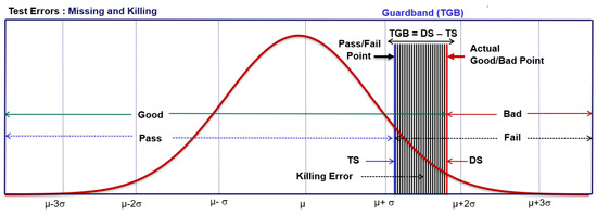 Given the tester inaccuracy, it is necessary to consider the TGB. As shown in Figure 7 and Table 2, the TGB is defined as the distance between the test specification and the design specification TGB = DS − TS [37,38]. The TGB operation will affect the test yield and quality. For example, with the characteristic parameter OTA (120 ps, 3 σT = 3 × 40 = 120 ps) of the tester set at a fixed value, if the test specification is set to 1045 ps (TS = DS − 3σT), high quality, low yield (Yt = 66.2%), and DL = 20 ppm will be obtained as the test result. Under the same conditions, select the same tester (OTA = 120 ps) to test the device under test (DUT). If the test specification is set to 1165 ps (TS = DS), low quality, high yield (Yt = 93.72%), and DL = 11756 ppm will be obtained as the test result. Based on the above, the product test yield and test quality affect each other. Therefore, the more the TS moves to the left, that is, the larger the TGB (the smaller the TS value), the better the shipment quality can be guaranteed, but the test yield will decrease. Likewise, moving the TS to the right (relaxation of the test specifications) will increase the test yield but at the same time reduce the test quality. Therefore, the yield can be sacrificed for high-quality products. To obtain a high yield, the quality will be relatively lower, and the product will be tested. Rate and test quality are interchangeable, but both cannot be had. Defects in the manufacturing process may cause quality problems. Appropriate TGB selection and effective testing methods are important conditions for improving product quality and yield.
