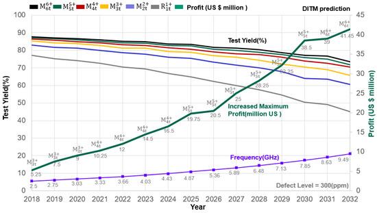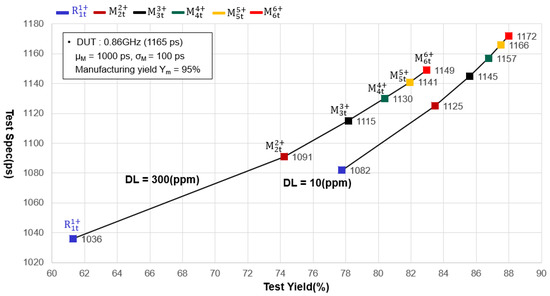 We considered the manufacturing progress together with product variation. We used data from Table 3 together with our DITM (model and formula). When we used OTA = 120 ps, DS = 1165 ps (traditional test methodology ), and TS = 1000 ps, we obtained Yt = 77.76% (set the test quality DL at 300 ppm,). As shown in Figure 10 and Table 3, applying multiplex testing (triple testing scheme) to the DUT under the same test conditions (DL = 300 ppm) could increase the yield from Yt = 77.76% () to Yt = 83.47% (). Following the above procedure to estimate the Yt for , we applied multiplex testing using the same values for TS (Ts = 1145 ps), which raised the yield from Yt = 77.76% () to Yt = 85.6% (). Over time, the use of traditional testing methods to test yield has shown ever-worsening results. However, we moved the TGB, changed the test conditions, and used multiplex testing to effectively improve the test yield. However, semiconductor manufacturers must contend with the slow advancement of testing technology. It will be extremely difficult to identify zero-defect products using IC tester that lag behind manufacturing technology [22,23,24,25,26,27,28]. For example, using traditional test methodology, to test DUT, TS = 1036 ps, limiting the DL to 10 ppm could obtain Yt = 63.10% (Figure 10 and Table 3). Next, we applied multiplex testing to the DUT under the same test conditions (DL = 10 ppm), which could increase the yield from Yt = 63.10% () to Yt = 82.95% ().