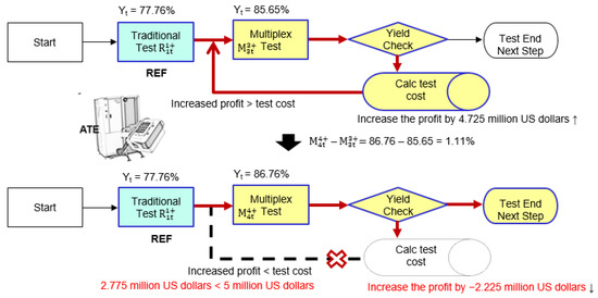 According to reports from the International Technology Roadmap for Semiconductors (ITRS), the testing technology is lagging far behind the design and manufacturing technologies [1,2]. If the tester technology stagnates, the quality and yield will worsen [3,4]. The testing capabilities of the tester and the development speed of the manufacturing technology are different. To ensure the reliability of critical electronic products, strict quality control is required to eliminate all defective parts in the total number of parts; however, owing to the slow development of testing technology, it is becoming increasingly difficult to use existing technology to select highly reliable electronic products. Therefore, suppliers must propose good methods to solve this problem. Currently, in the semiconductor testing industry, retesting is being applied in the production process to improve test results [5,6,7,8,9,10,11,12,13,14,15,16,17,18,19]. In the actual test in the test factory, the retest strategy greatly improves the test yield. This paper proposes a new test method (multiplex tests) to improve testing efficiency. The new method involves moving the test guardband (TGB) and extending the test time, retesting the chips that pass the test several times, and repeatedly searching for truly reliable products to increase the test yield. Conversely, we used multiplex testing methods to improve the quality of products. We all know that zero-defect high-quality products (Zero Defect Manufacturing, ZDM) [20,21] are the ultimate goal of all industries. The quality requirements in the biomedical or automotive electronics industries are stringent, with higher safety requirements. Therefore, we used the multiplex testing method to reduce the errors that occur during testing, the mobile test guardband to reduce the generation of killing errors and missing errors, and obtain products with near-zero defects [22,23,24,25,26,27,28]. Multiplex testing can improve the test yield and test quality; however, if the test time and the number of tests are increased, the test cost will gradually increase. Furthermore, when the increased test cost is higher than the increased profit (the profit obtained by expanding the test yield), it will cause a loss of profit. Therefore, we applied a retest strategy to IC testing [29,30,31,32,33] and found an enhanced test procedure (enhanced IC test system (ETS)) that calculates the required test times by improving test yield and test cost. The enhanced solution we propose can avoid directionless retesting. It can save wasted manpower and time and minimizes the cost of testing. We achieved the best balance between increasing profit and increasing test cost using the enhanced test mechanism and the premise of increasing the test yield rate.