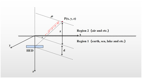 To investigate the performance of the proposed numerical model and the combined method, the measured magnetic fields strengths are compared with the numerical results of the submerged HED model. As shown in Figure 1, the source is selected as an HED with the electric moment of 14 Am, and it was located in a two-half homogeneous space. The HED is 1 m away from the interface and located in region 1 where S/m, which are the general parameters of the soil. Region 2 would be air with S/m, and the fields of interest are analyzed.