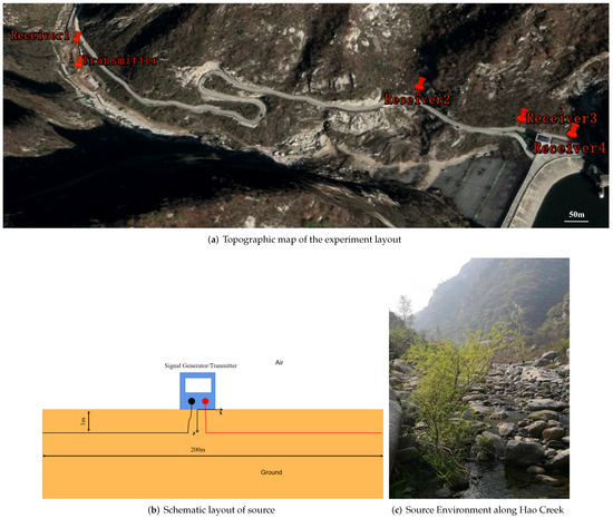 An experiment has been conducted in a reservoir in the Qin Mountain in Northwestern China (109°49′ E, 33°42′ N), shown in Figure 2a, to study the radiation performances of the submerged line current and the wave diffusion along the Earth’s surface. The soil of the region was composed of mud, sand and crushed granite where conductivity is around 5 S/m. The line current source is buried around 1-m deep in a shallow horizontal layer and connected to a transmitter which would send ELF signals. The schematics of the source are shown in Figure 2b. In the experiment, the copper wire is around 200 m long, the radius is around 1 mm and the emission current is constantly 0.07 A. Thus, the emission intensity of the envisioned electric dipole is 14 Am. The emitting frequencies of the ELF signals are set at 3 Hz, 5 Hz and 9 Hz.