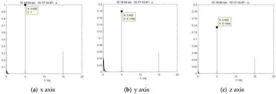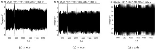 A commercial magnetic sensor produced by Huashun Ltd. (Xi’an, China) with a high sensitivity of 216 mV/nT and low noise level of 0.057 pT/ at 1 Hz, shown in Figure 3a, is adopted to collect magnetic signals. The details of the ferrite rod sensor is shown in Table 1. To investigate the magnetic fields’ complete performance, three sensors were perpendicularly assembled relative each other, shown in Figure 3b, which are placed as high as 20 cm away from the Earth’s surface. The three-axis magnetic collection system would transfer the collecting magnetic field into voltage with 24-bit sampling, which would be recorded in the data acquisition system based on NI modules with sampling rates of 200 Hz, as shown in Figure 3c. To obtain the field strength, the values at the frequency of interest would be collected and transferred by sensitivity. A 5 Hz square-wave signal collected by the system is shown in Figure 4 and Figure 5.