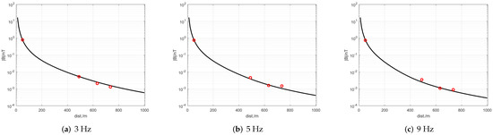 The comparison of the two field strengths is illustrated in Figure 6 with distance as the horizontal axis. From the figure, we can see that both data agree well but with some slight differences with 0.026 nT as the maximum (10%) at 9 Hz around 490 m. The errors are mainly caused by the ideal assumption of the ideal layered structures and the noise produced by the collection system and introduced by the environment. Thus, it can be easily concluded that the proposed model would be a promising substitute for the preliminary study of such channels at the ELF band, especially for locations that are hard to reach. At the same time, it can be easily observed that, in the ELF band, the influences of the frequency on field strength are limited, especially in the closer range.