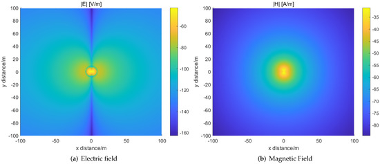 The electric field and magnetic field distributions at - ( m) of the ELF wave at 5 Hz with an x-axis located HED as the source are shown in Figure 7. The electric moments is 14 Am, and the figure is illustrated in logarithm form. A typical distribution of an electric dipole can be observed and the magnetic field suffers less power loss than the electric field, which indicates the potential of the magnetic signals of ELF communication techniques.