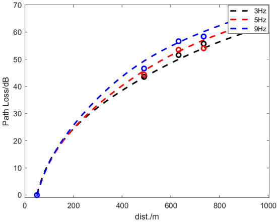 The power loss of the signals is illustrated in Figure 8. To calculate path loss, the magnitude of the magnetic field was measured and recorded at 50 m, which was chosen as reference . Then, the ratio of the field magnitude at ith point to the ones at reference point would be calculated and followed by a logarithmic operation, i.e., . From the figure, it can be observed that path loss increases with an increase in the distance, but frequency would have limited impact.