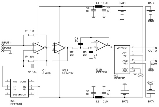 The signal at the output of previous (active filter) stage was then fed into a highly linear, unity gain precision isolation amplifier ISO124P (Texas Instruments, Dallas, TX, USA) and from the output of this amplifier to the output terminals.