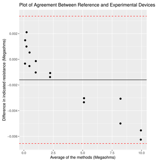 Figure 4, the observed values of difference follow a linear trend. Mean differences between instruments were found to be −1.6 kΩ with 95% limits of agreement (lower −6.6 kΩ; upper 3.4 kΩ). Additionally, when comparing relative values of difference, such a value is in proportion with the reported output value, which is notably large.