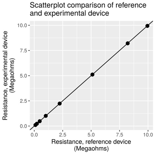 Figure 4, the experimental device shows certain measurement offset. Mean difference was computed at −1.6 kΩ with 95% limits of agreement (lower: −6.6 kΩ; upper: 3.4 kΩ). This offset is not of constant value but is rather linearly dependent with respect to the resistance value presented to the input terminals. For all measurements, the observed difference is still within 95% limits of agreement.