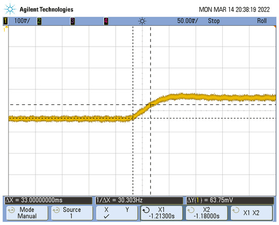 When estimating the step response of the prototype transducer, for instant change of resistance ∆R = 100 kΩ, the observed time constant was 33 ms. The recorded waveform is presented in