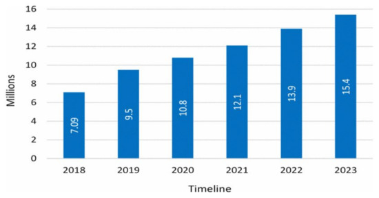 One of the most prevalent attacks on the IoT network is denial of service (DoS). According to Cisco’s annual Internet study, DDoS cyberattacks are predicted to rise from 2018 to 2023. Figure 1 compares the number of possible DDoS attacks for each year [8]. It is also observed that DoS attacks on IoT are continuously increasing every year. It is reported by the Palo Alto Networks Unit 42 research team, the traffic of 98% of IoT devices is not encrypted which exposes the confidential data on network traffic and causes multi-level attacks [9] on the network and systems. When these vulnerable IoT devices are connected with the network, it increases the threat space for attackers. According to Kaspersky’s research, 1.5 billion attacks on IoT devices have been reported in the first 6 months of 2021 [10].