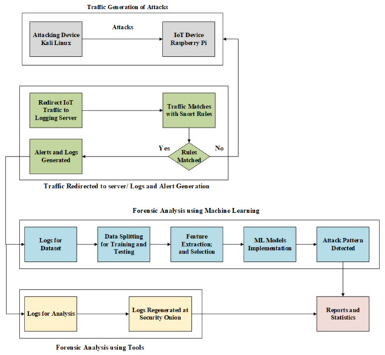 The proposed framework for forensic analysis of IoT devices under attack consists of four modules, as shown in Figure 2. First, traffic generation of attack is responsible for attacks generation from Kali Linux system to IoT devices used under experimentation. Second, traffic redirection logging server and alerts/logs generation is responsible for redirection of traffic from IoT device to logging server, where traffic is analyzed and logs/alerts are generated when traffic is matched with rules written in logging server. Third, forensic analysis using forensic server is responsible for regeneration of logs captured by the logging server. Logs are regenerated and necessary information about the attack and attacker is extracted. Fourth, forensic analysis using machine learning model is responsible for detection of attacks using different machine learning models such as Random Forest Classifier [48], Decision Tree Classifier [49], Naïve Bayes Classifier [50], LDA Classifier [51], MLP Classifier [52], and assemble (Voting Classifier) [53]. The performance of these models is observed based on different evaluation parameters.