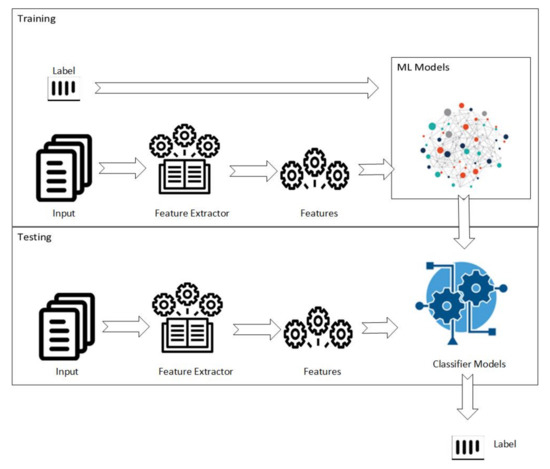 In the training phase, inputs and the labels are fed to machine learning algorithms after the feature extractor extracts the features from inputs. Different machine learning algorithms are applied in search of a best-fitting model. Each model works differently because of the different functions on which data are trained. In the testing phase, inputs are fed to the feature extractor to obtain the features. Then, these are fed to trained classifier models to extract the labels which are the predictions of these models. As previously, we labeled our data. So, the specific attack can be guessed from the label the model predicts. A generic diagram of the training and testing phase is shown in Figure 4.