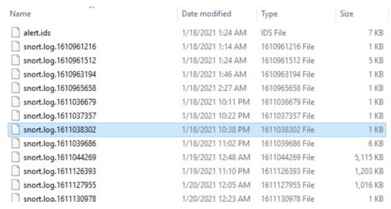 When the traffic from Raspberry Pi is redirected to logging server snort, then the logs and alerts generation process starts. Redirected traffic is received on the Ethernet port of a logging server having the IP address of 192.168.56.2. Snort matches traffic with rules written for attacks. If the match is successful, then the log file is generated. The log files are generated with a different name every time the command is started. Moreover, new log files are generated after the log file reached its defined maximum capacity. The generation of log files with a new name arises a problem while implementing the agent-based log monitoring. So, individual log files of respective attacks are generated manually. These files are stored on the logging server with different names. Snort is configured to capture the malicious traffic by writing the rules in the file local.rule, which is presented in the directory of snort. When snorts starts, it scans for different interfaces to track the malicious traffic. After setting up the rules for all attacks, the configuration file is updated and tested; these rules are incorporated in the snort rules. After running snort IDS mode, it monitors the network traffic which was redirected from the Raspberry Pi. This traffic is compared with rules. When a DoS attack is launched, then incoming traffic matches with the rule and snort starts to generate alerts and stores the logs of this traffic. These logs are further analyzed with forensic servers and machine learning models for the detection of attacks. Figure 5 shows that log directory. The rules for denial of service (DoS) attack is described below. Similarly, rules for other attacks are also incorporated into the rules directory.
