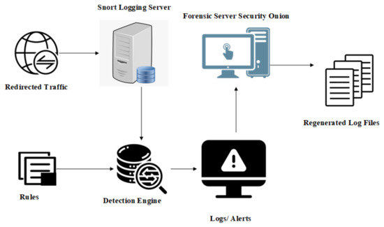 In this framework, traffic of the IoT device is redirected to a logging server and logs are generated. To overcome the limitation of low memory and low processing power of IoT devices, traffic of IoT devices is redirected to a logging server with an IP address of 192.168.56.2. All devices are connected in an M2M manner, so they can directly communicate with each other. A logging agent (WAZUH) [57] was used for log storage on the third-party server. However, the ARM architecture of the Raspberry Pi does not support it. Then, IPtables are used to redirect the network traffic to the snort gateway with an IP address of 192.168.56.2. The snort is installed on the logging server. Snort rules are written and included in the configuration file for specific attacks. Snort analyze the traffic coming to IoT device and matches with the snort rules. If the match is successful by the detection engine of the logging server, then a snort alert for attacks is generated and logs are stored at the logging server. If not, then these packets are discarded. Logs of attacks generated by snorts are in pcaps format. CIC flow meter open-source tool [58] is used to convert these pcaps files to CSV files. Then, a CSV file of logs is used for the machine learning models because ML cannot be applied on pcap files.