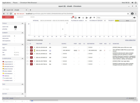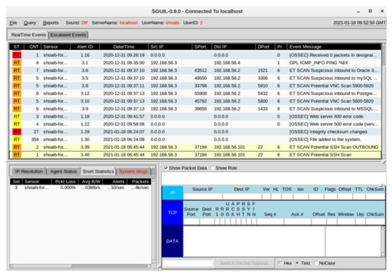 Forensic analysis using security onion is applied on logs captured by the logging server snort. As Figure 6 shows, logs based on rules are regenerated in the security onion. We used security onion as the forensic server, which is a free and open-source Linux distribution with security monitoring, intrusion detection, and log management capabilities. It includes many tools; we used sguil and squirt for logs analysis. Snort is CLI based, where logs are not properly analyzed. Therefore, sguil is GUI for snort and logs are easily visualized. Security onion has two network interface cards (NICs). One interface enp0s3, which has the IP address of 192.168.56.4, is used for the management of the security onion, while other interfaces enp0s8 work in the promiscuous mode. It means that it is connecting to the virtual server and monitoring all the network traffic presented in this network. It sends packets to all network interfaces of the complete network to obtain information about the connected devices. We have captured the log files through the snort IDS. These logs are regenerated through security onion. There are many ways to import these logs as follows