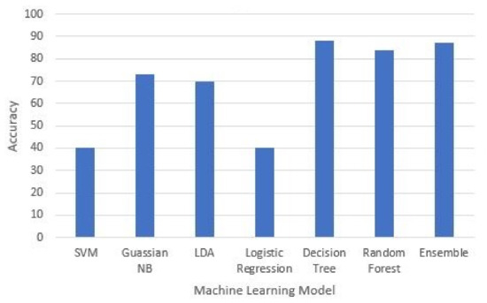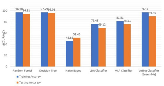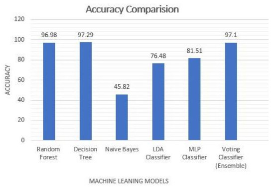 In the ML approach, a dataset derived from logs is utilized. In order to preprocess the data, we used a variety of techniques. We remove unnecessary fields, remove any characteristics that do not contribute to classification, encode categorical features, and numerical features are also scaled within the range of 0 and 1 to ensure data consistency, completeness, and soundness. For feature selection and extraction, we used a variety of techniques such as feature importance, backward elimination, and k-best. Changing k-values in the k-best technique yielded efficient results. The dataset is divided into two parts: training and testing, with a 70/30 split. As mentioned in the previous section, various classifiers are used to train and test ML models. The decision tree classifier achieved 97.29% accuracy after training and testing multiple classification models. The accuracy of various machine learning models used in our proposed system is depicted in Figure 9. In the forensic process, these models aid in the detection of attacks faster and more reliably.