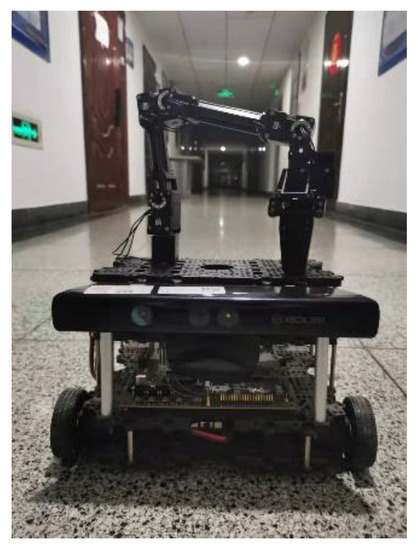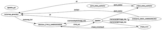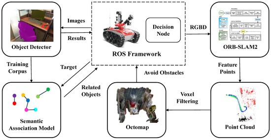 (3) Several functions, such as object detection, self-localization, obstacle avoidance, and map building, based on ROS and the classical ORB-SLAM2 [3] method, are integrated to the object navigation strategy. The robot will perceive the surrounding environment through the RGB-D camera and the control system of the robot will decide the next destination according to the current observation, the robot’s position, the environment map, and the semantic association model.