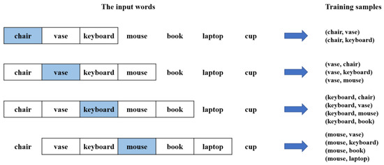 (2) To help the robot obtain semantic relationships, it is necessary to quantify the correlation between different objects. First, this paper uses the object detection framework Mask R-CNN [2] to calculate the Euclidean distance between common objects detected in the images and to gather extensive object–distance relationships for objects. Then, the word-to-vector framework, skip-gram, is used to learn these distance relationships and obtain the universal semantic similarity ranking; that is, the final semantic association model.