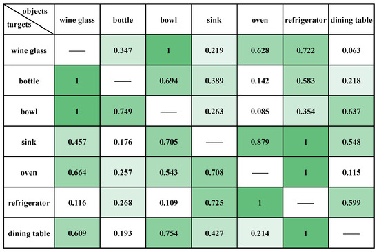 Taking the “bottle” as an example, its semantic correlation value with “wine glass” is 1 and the value with “bowl” is 0.694. By comparing these values, it can be concluded that the probability of “a wine glass is near a bottle” is greater than that of “an oven is near around a bottle”. In addition, according to the experimental results, the semantic relevance between “wine glass”, “bottle”, and “bowl” is obviously higher, which is apparent in our daily lives.