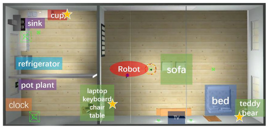 This paper built a 7 m ∗ 15 m virtual apartment in Gazebo [25], which contains some common indoor objects, as shown in Figure 10. The virtual apartment is divided into three different function regions, including the kitchen, bedroom, and office, in which the objects have been marked. The star indicates the target that the robot is looking for. The robot is a three-wheeled car equipped with a Kinect camera, whose observation angle range is set to π/3 and the observation distance range is set to 0.05 m–10 m. The robot will start at a random position, search the target autonomously, and build the environment map along the search path at the same time. In the simulation tests, each search task is executed 10 times. The searching time is limited to five minutes and the final distance between the robot and the target is limited to 1 m. If not, it will be considered a failure.