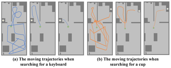 Figure 11 shows the moving trajectories of the robot when searching for the keyboard and cup, respectively, and the results coincide with Table 2. The experimental results show that the Random Search method is very time-consuming, and the robot may walk quite a long distance, but still cannot find the target. When using the Traversal method, the robot can successfully find the target after a period of searching, but the moving distance varies with different tasks, as Figure 9 shows. However, by using the autonomous object navigation strategy proposed in this paper, the robot can find the target in a relatively short time.