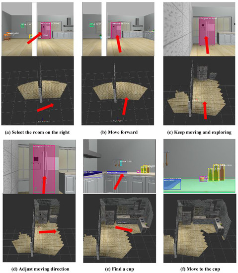 Figure 12 records the moving process of the robot when looking for the cup. The top half of each sub-graph are the scenes observed and the moving decision made by the robot. The bottom half of each sub-graph is the environment map built by the robot. At the beginning, the robot can see the refrigerator on the right, thus speculating that the cup is more likely to appear in the room on the right. Before moving to the refrigerator, the robot will first turn around to check whether there are other more related objects in the room. However, due to the limitations on its camera resolution, no more effective objects are found, so the robot chooses to move to the refrigerator and tries to find some other relevant objects. With the help of the Octomap built by itself, the robot finds that only the right side can pass when it arrives near the refrigerator, so the robot decides to make a turn, as Figure 12d shows. After turning here, the robot finds a cup and other related objects, so it finally moves to the front of the target object.