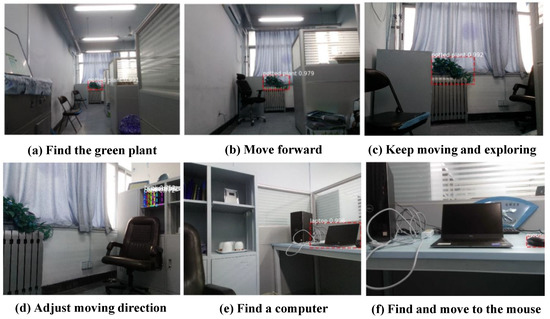 Figure 14 shows an example of the robot searching for the “mouse” in the office. At the beginning, the robot found the “green plant” with the highest degree of association with the “mouse” in the current view, so it moved towards the “green plan” to Figure 14c. Through the observation of the surrounding environment, the robot found the “book”, which is related to the “mouse”, so it continued to move towards the “book” until it found the “computer”. The “computer” is more related with the “mouse” according to the semantic association model, so the robot decided to move towards the “computer”. Finally, the robot found the target object “mouse” next to the “computer”. The strategy proposed in this paper can make the forward direction of the robot more purposeful.