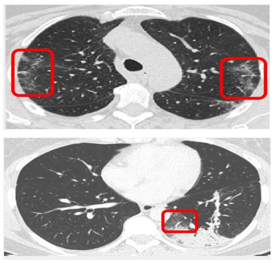 Previous research on CT scan-based diagnostics has related many visual indications to the presence of COVID-19 symptoms. As shown in Figure 1, the red rectangles indicate the existence of ground-glass opacities (GGO), whereas the further distributions of aberrant lesions are the after-effects of the blockages generated [,]. GGOs reflect the mucus inflammation present, and the additional distributions of abnormal lesions are the after-effects of the obstructions caused. All cases of GGOs, pleural effusion, and consolidation are classified as COVID-19 indicators in this investigation and are used as factors in the CNN model presented in this case study to classify CT scans.