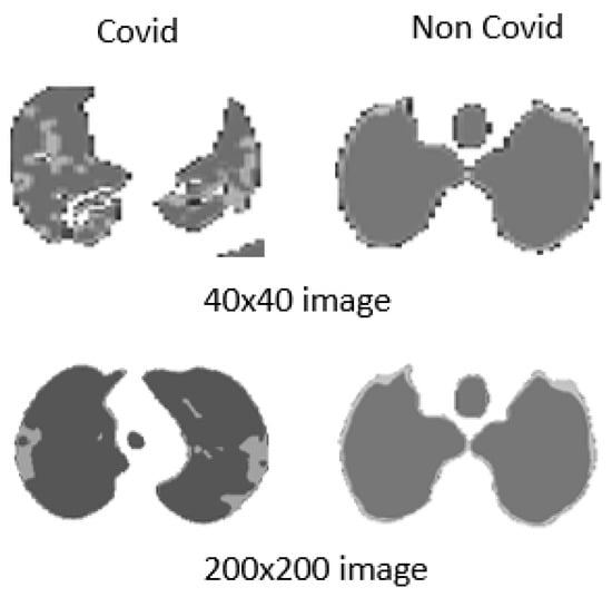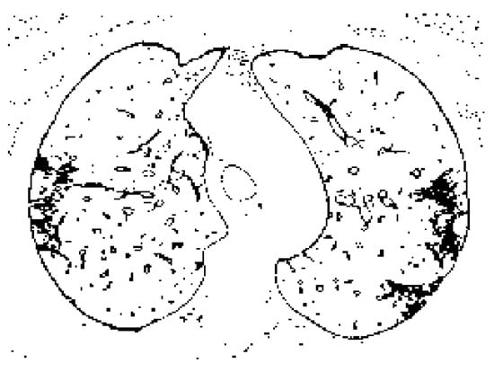 To generate the most effective training results, the input data was pre-processed with various methods []. The approach involved converting grayscale input images into binary images using fuzzy logic to isolate ground-glass opacity sections. Grayscale conversion to binary images presented a variation of results. To extract meaningful features from the training set, fuzzy logic edge detection was used on a binary image that was created from a grayscale image filter using adaptive thresholding. Figure 2 shows a COVID scan in binary format. The aim was to analyze the GGO and consolidation areas to form a distinct differentiation between COVID and non-COVID scans. The consensus is that COVID scans display patterns of white pixels (1′s) in binary form, whereas non-COVID scans will display minimal white pixels or none. Figure 3 shows inverted versions of the source image where the black pixels are the isolated consolidation sections []. Figure 4 is an example of a COVID image that is filtered to display the most important parts of the image. The white patches on the edges are the detections of GGO presence. By using the grayscale thresholding function, the values were calculated within the range ‘i’ as shown by the expression (95 < i < 145).