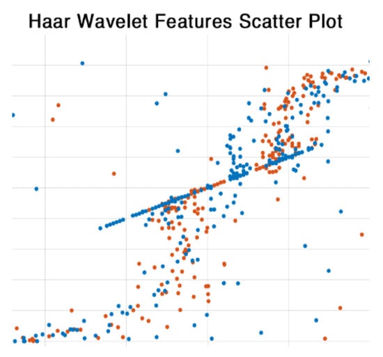 Figure 5 shows the distribution of features for each class. Here the bag of features function generates features with noticeable separation around the bottom left-hand side of the graph, whereas the top right-hand side produces more overlapping features. For optimal classification, the discrete wavelet transformation (DWT) approach was also investigated, where the Haar Wavelet variant was tested. This type includes finding the approximate coefficients of sudden changes in pixel intensity [] as shown in (1)