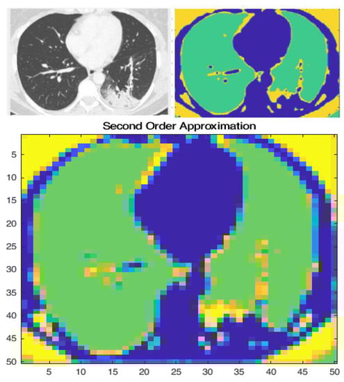 A median filter was used to remove the noise which isolated the ground-glass opacities and consolidation. A multiple-level grey-level threshold function was performed. The multi-level thresholding technique takes the regions of the image with the most standard deviation as separate gradients. It then uses this data to create indices for each region of the image that has the greatest deviation in grey levels to isolate specific elements. The image is then re-sized to a lower resolution and applied to various classifiers tested in this case study.