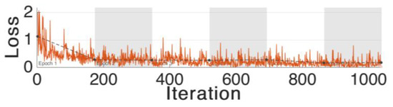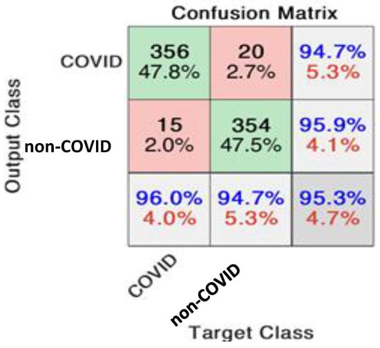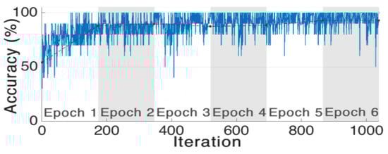 The COVID-19 dataset chosen for this study is reported in []. The dataset contains COVID-19 images collected from hospitals in Sao Paulo, Brazil. The dataset included 1252 CT scans that were positive for SARS-CoV-2 infection and 1230 scans for patients who were non-infected by SARS-CoV-2. In total, 2482 CT scans were available. This dataset is particularly favorable as the negative COVID-19 scans do not contain signatures of other lung diseases. The data contained images that were anonymous and cannot be traced back to the patients. The images are in JPEG format and have resolutions of 202 × 256. Tests for GoogLeNet splits the data set in a 70:30 ratio (1736 training images, 745 test images). The key difference in the dataset provided by [] is that there are significantly more samples to work with (2482) and the non-COVID samples are of healthy patients with no other conditions. The CNN was used where simulations were performed by using GoogLeNet. An epoch is a full pass through the entire dataset. During training, the accuracy of the network reached a plateau, which made it clear that the accuracy was no longer improving. The training was stopped, and once completed, the trained network was returned. The training accuracy is shown in Figure 7 and the loss rate is shown in Figure 8. Results obtained by using CT scan images are shown in Table 5.
